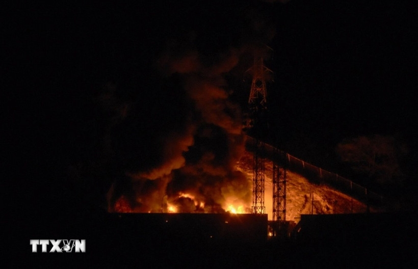 Khói lửa bốc lên tại khu phức hợp quân sự Fuerte Tiuna lớn nhất Venezuela, sau một loạt tiếng nổ ở thủ đô Caracas. Ảnh: TTXVN