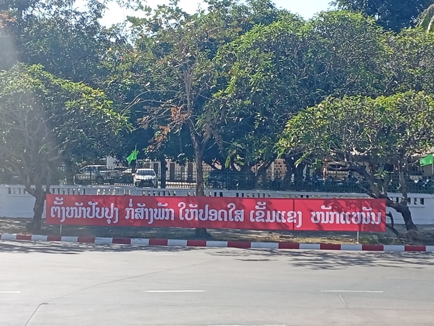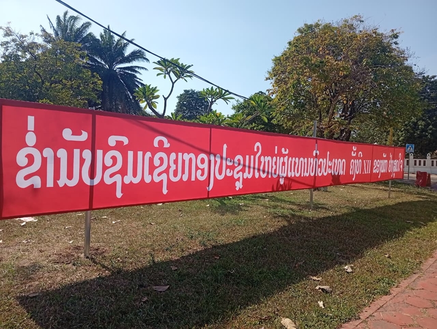 Nhiều băng rôn, khẩu hiệu lớn như: Chào mừng Đại hội đại biểu toàn quốc lần thứ XII Đảng Nhân dân Cách mạng Lào, Cộng hòa Dân chủ Nhân dân Lào muôn năm, Đảng Nhân dân Cách mạng Lào muôn năm, Chủ tịch Kaysone Phomvihane sống mãi trong sự nghiệp cách mạng và trong tâm trí nhân dân Lào thể hiện rõ niềm tin, niềm tự hào và quyết tâm của toàn Đảng, toàn quân và toàn thể nhân dân Lào hướng về Đại hội. Ảnh: pasaxon.org.la