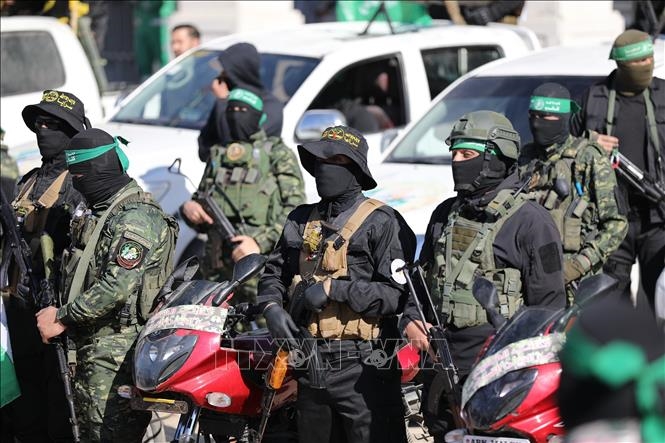 Các thành viên Lữ đoàn Al-Qassam và Al-Quds được triển khai trong lễ trao trả 4 nữ binh sĩ Israel cho Ủy ban Chữ thập đỏ quốc tế (ICRC) tại thành phố Gaza, ngày 25-1-2025. Ảnh: AA/TTXVN |