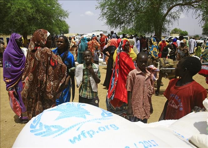 | Người tị nạn xếp hàng nhận lương thực cứu trợ tại bang Nam Kordofan, Sudan. |