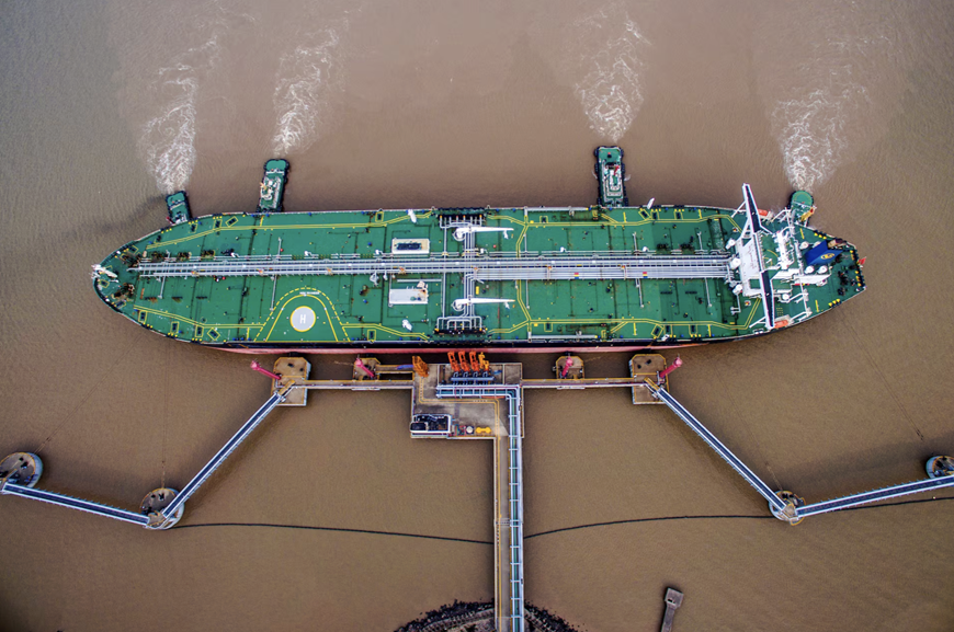 Một tàu chở dầu đang dỡ dầu thô tại một cảng ở tỉnh Chiết Giang, Trung Quốc. Ảnh: Reuters