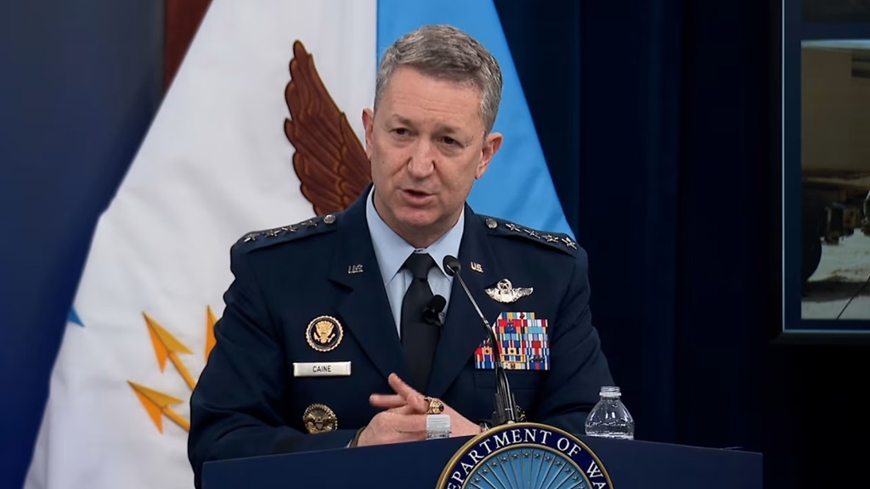 Chủ tịch Hội đồng Tham mưu trưởng Liên quân Mỹ, Tướng Dan Caine, phát biểu tại cuộc họp báo tại Lầu Năm Góc vào thứ Ba, ngày 10-3 Ảnh: Pool