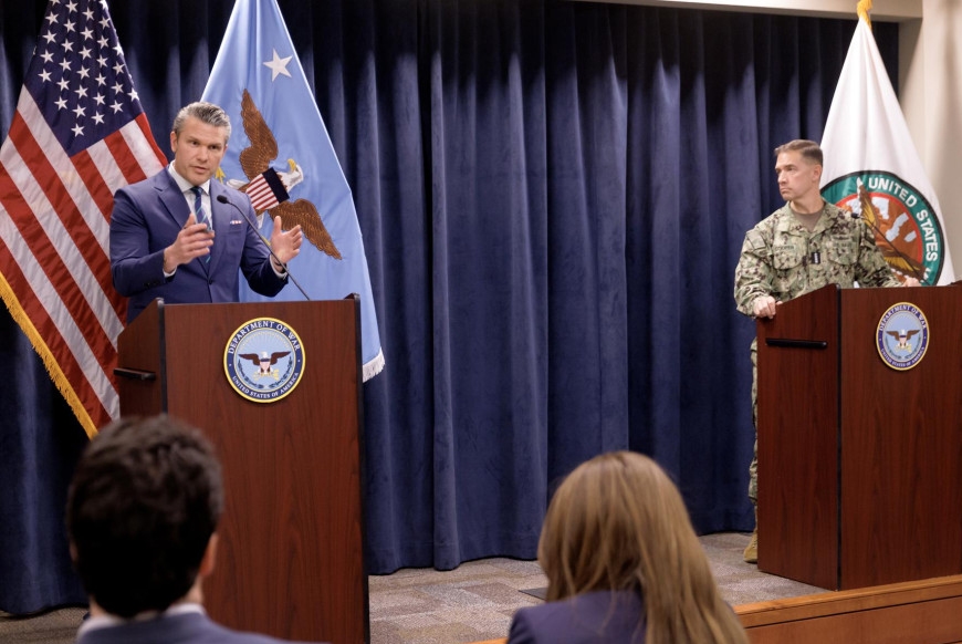 Bộ trưởng Chiến tranh Mỹ Pete Hegseth (trái) phát biểu trong một cuộc họp báo tại trụ sở Bộ tư lệnh Trung tâm Mỹ ngày 5-3. Ảnh: La Patria