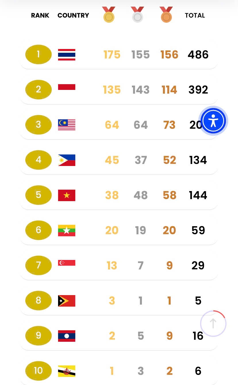 Trên bảng xếp hạng huy chương ASEAN Para Games 13, chủ nhà Thái Lan dẫn đầu với 175 HCV, 155 HCB và 156 HCV. Theo kế hoạch, đại hội bế mạc tối 26-1.