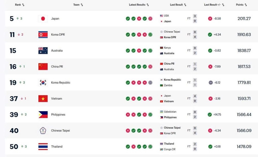 | Đội tuyển bóng đá nữ Việt Nam xếp hạng 37 thế giới và số 6 châu Á. |