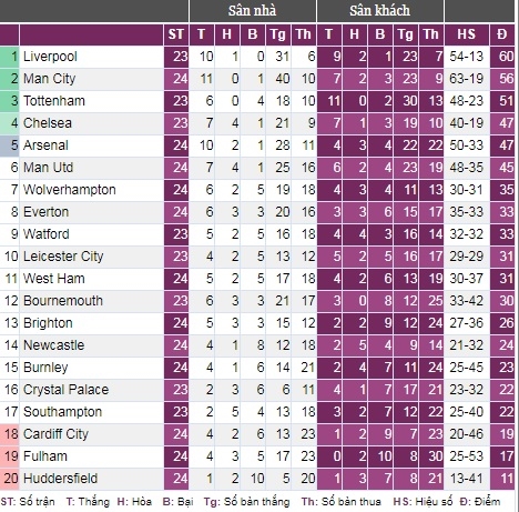Bảng xếp hạng tạm thời của Premier League. Ảnh: bongdaso.com |
