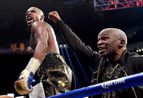 Floyd Mayweather (trái) ăn mừng chiến thắng liên tiếp thứ 50 trong sự nghiệp thi đấu quyền anh nhà nghề của mình. Ảnh: Dailymail