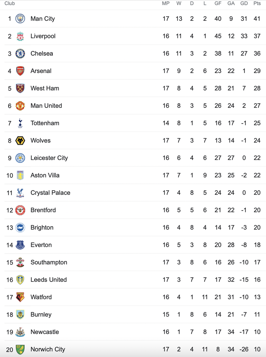 | Bảng xếp hạng giải Ngoại hạng Anh sau lượt trận rạng sáng 16-12 (giờ Việt Nam). Nguồn: Google News. |