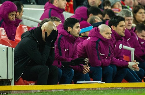 HLV Pep Guardiola thất vọng khi chứng kiến các học trò liên tiếp mắc sai lầm. Ảnh: Dailymail |