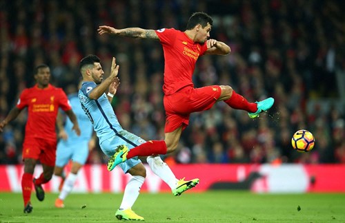 Tình huống Dejan Lovren cướp bóng ngay trước mũi giày của Sergio Aguero trong hiệp 1. Ảnh: Dailymail