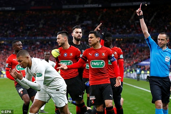 Trong ngày buồn của PSG, ngôi sao trẻ Mbappe nhận thẻ đỏ trực tiếp ở những phút cuối cùng của hiệp phụ thứ hai sau pha phạm lỗi nguy hiểm. Ảnh: EPA |