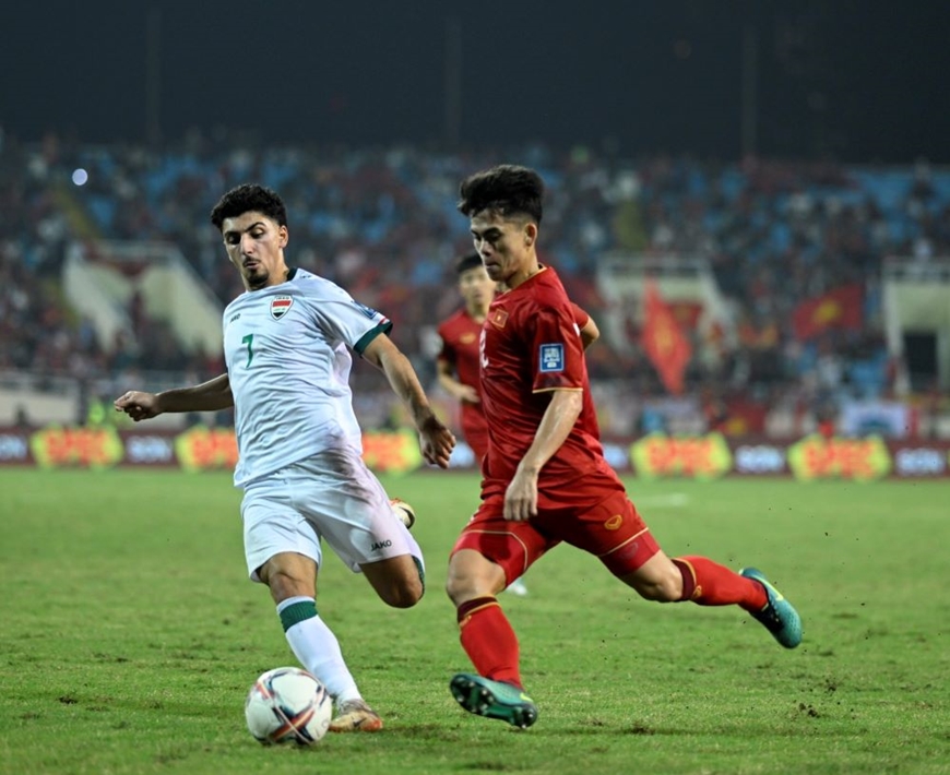 | Tiền vệ Văn Khang (bên phải) thi đấu năng nổ trong trận gặp đội tuyển Iraq. Ảnh: VIỆT TRUNG |