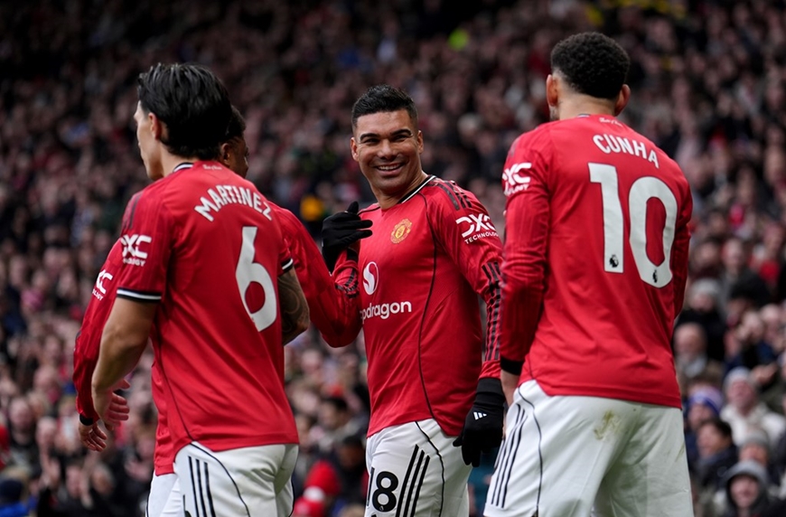 | Casemiro (giữa) mừng bàn thắng mở tỷ số cho Man Utd. Ảnh: Sky Sports |