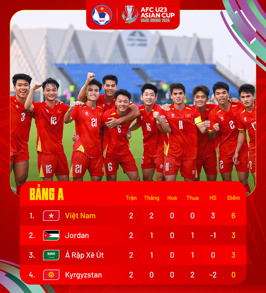 | Xếp hạng bảng A sau 2 lượt trận. Ảnh: VFF |