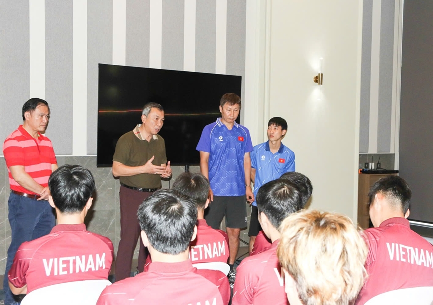 | Chủ tịch VFF Trần Quốc Tuấn động viên U22 Việt Nam trước trận bán kết SEA Games 33 |
