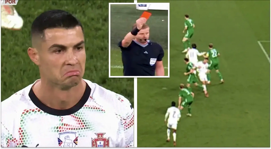 | Ronaldo nhận thẻ đỏ trong ngày đội tuyển Bồ Đào Nha thua trắng Ireland. Ảnh: Tribuna |