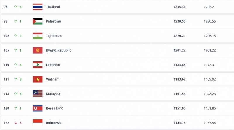 Cụ thể, với chiến thắng 3-1 và 1-0 trước đội tuyển Nepal tại vòng loại Asian Cup 2027, thầy trò HLV Kim Sang-sik được cộng thêm 13,7 điểm. Nhờ vậy, đội tuyển Việt Nam tăng thêm 3 bậc từ vị trí thứ 114 lên 111 thế giới.