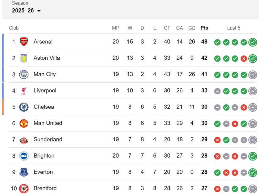 | Bảng xếp hạng Ngoại hạng Anh mới nhất. Ảnh: Google |