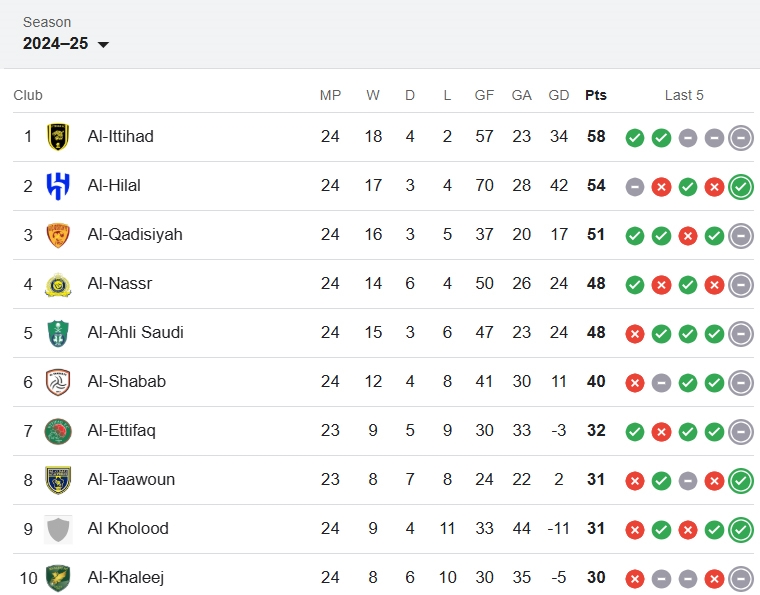 Bảng xếp hạng Saudi Pro League mới nhất. Ảnh: Google |