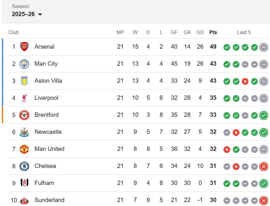 | Bảng xếp hạng Ngoại hạng Anh 2025-2026. Ảnh: Google |