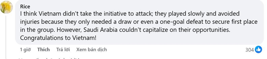 Cổ động viên Thái Lan cũng phải dành lời tôn trọng: “Một màn trình diễn tuyệt vời của Việt Nam. Chúc may mắn ở vòng tiếp theo”.