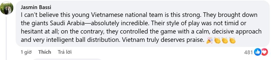 Cổ động viên Indonesia - Jasmin Bassi bày tỏ sự ngỡ ngàng: “Tôi không thể tin đội tuyển trẻ Việt Nam lại mạnh đến vậy. Họ đánh bại gã khổng lồ U23 Saudi Arabia một cách bình tĩnh, quyết đoán và chuyền bóng rất thông minh”.