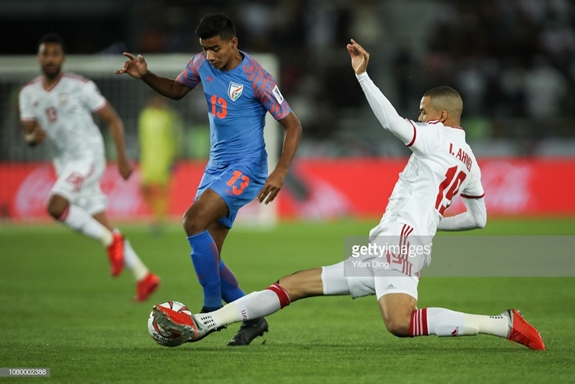 Hậu vệ của UAE (áo trắng) truy cản tình huống tấn công của Ấn Độ. Ảnh: Getty |