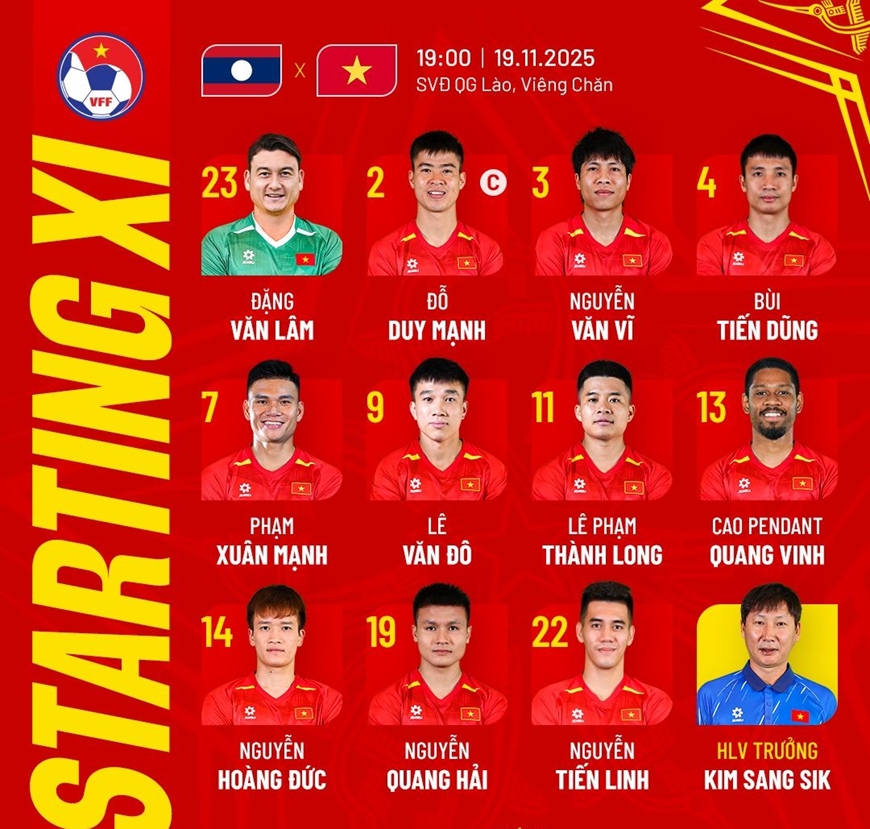 Tối 19-11, đội tuyển Việt Nam làm khách trên sân của đội tuyển Lào thuộc lượt trận thứ 5 bảng F vòng loại thứ 3 Asian Cup 2027. Đúng như dự đoán, huấn luyện viên Kim Sang-sik không mạo hiểm dùng tiền đạo Xuân Son ngay từ đầu mà sử dụng hàng công với Tiến Linh, Quang Hải.