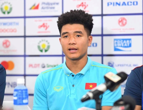 Tiền đạo Hà Đức Chinh trong cuộc họp báo sau trận đấu. |