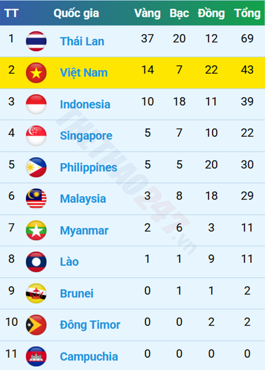 Tính đến 22 giờ ngày 11-12, Đoàn thể thao Việt Nam xếp thứ 2 trên bảng tổng sắp huy chương với 14 HCV, 7 HCB, 22 HCĐ.