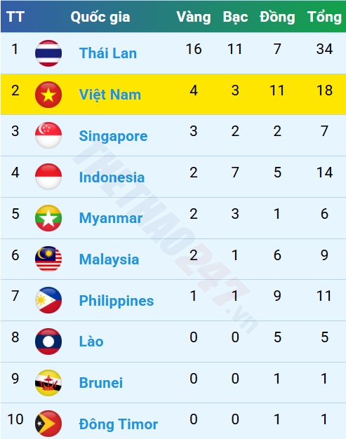 Trên bảng tổng sắp huy chương, đoàn chủ nhà Thái Lan đang dẫn đầu với 16 HCV, 11 HCB và 7 HCĐ, bỏ xa các đoàn khác. Đoàn thể thao Việt Nam với 4 HCV, 3 HCB, và 11 HCĐ, tạm xếp thứ hai.
