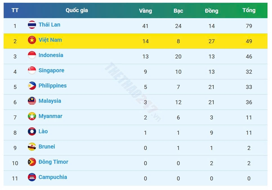 Bảng tổng sắp huy chương SEA Games 33 tính đến 11 giờ ngày 12-12.