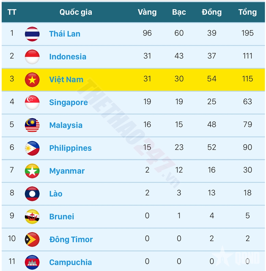 Cập nhật bảng tổng sắp huy chương SEA Games 33 sáng 13-12 tính đến 11 giờ 30 phút.