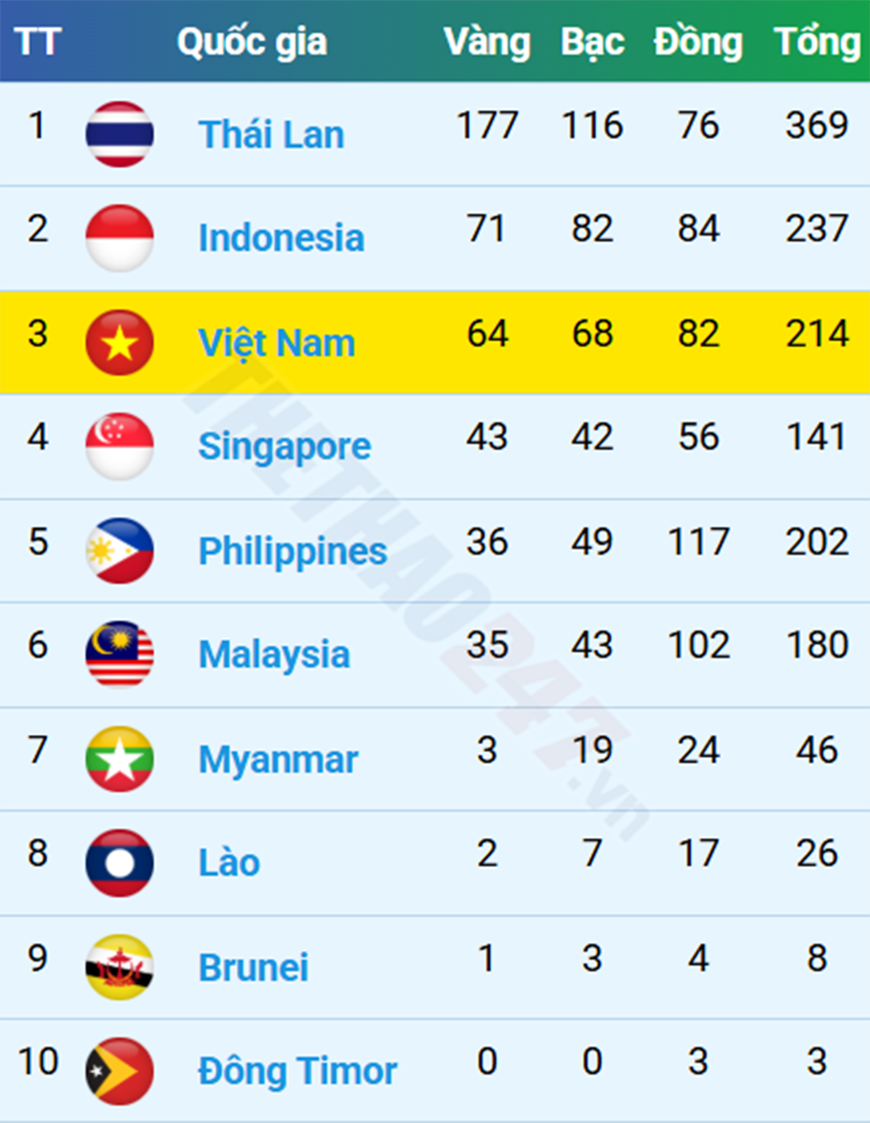 | Bảng tổng sắp huy chương SEA Games 33 tính đến 19 giờ ngày 17-12. Ảnh: Thethao247 |