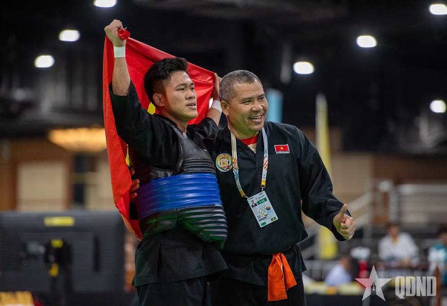 | Võ sĩ Nguyễn Tấn Sang chung vui cùng huấn luyện viên trưởng Nguyễn Văn Hùng. Ảnh: VIỆT AN |