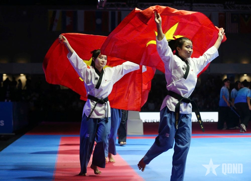 Phải đến cuối giờ chiều 10-12, nhóm võ sĩ Nguyễn Xuân Thành - Trần Đăng Khoa - Trần Hồ Duy - Lê Trần Kim Uyên-Nguyễn Phan Khánh Hân-Nguyễn Thị Y Bình xuất sắc giành HCV nội dung quyền biểu diễn sáng tạo đồng đội nam nữ môn taekwondo. Trong phần thi chung kết, các võ sĩ Việt Nam thực hiện kỹ thuật ở độ khó cao nhất mà không có sai lầm nào, thuyết phục được tất cả trọng tài và giành 8,060 điểm.