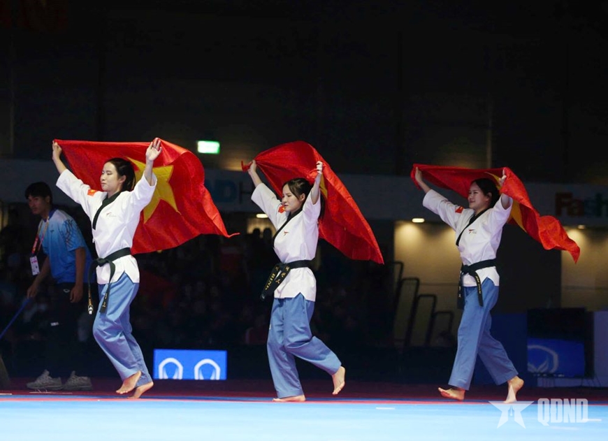 Chiều 10-12, đội Taekwondo Việt Nam đã thi đấu ấn tượng khi giành huy chương vàng ở nội dung quyền biểu diễn sáng tạo đồng đội nam nữ tại SEA Games 33.