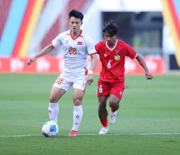 | U22 Việt Nam (áo trắng) gặp U22 Lào trong trận đấu thuộc bảng B môn Bóng đá Nam SEA Games 33. Ảnh: Báo Công an nhân dân |