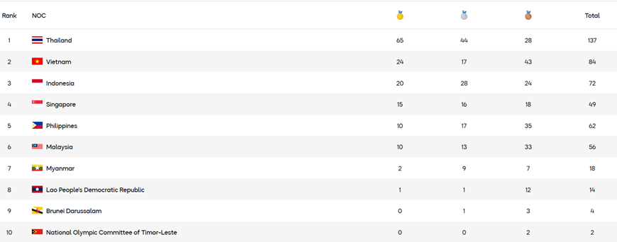 Tính đến 21 giờ 20 phút ngày 12-12, Đoàn thể thao Việt Nam củng cố vị trí thứ 2 trên bảng tổng sắp huy chương với 24 HCV, 17 HCB, 43 HCĐ. Chủ nhà Thái Lan tiếp tục xếp số 1 với 65 HCV, 44 HCB, 28 HCĐ. Indonesia xếp thứ 3 với 20 HCV, 28 HCB, 24 HCĐ.