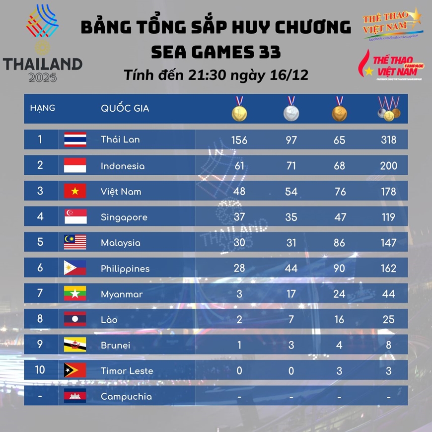 | Bảng tổng sắp huy chương SEA Games 33 tính đến 21 giờ ngày 16-12. Ảnh: TTVN |