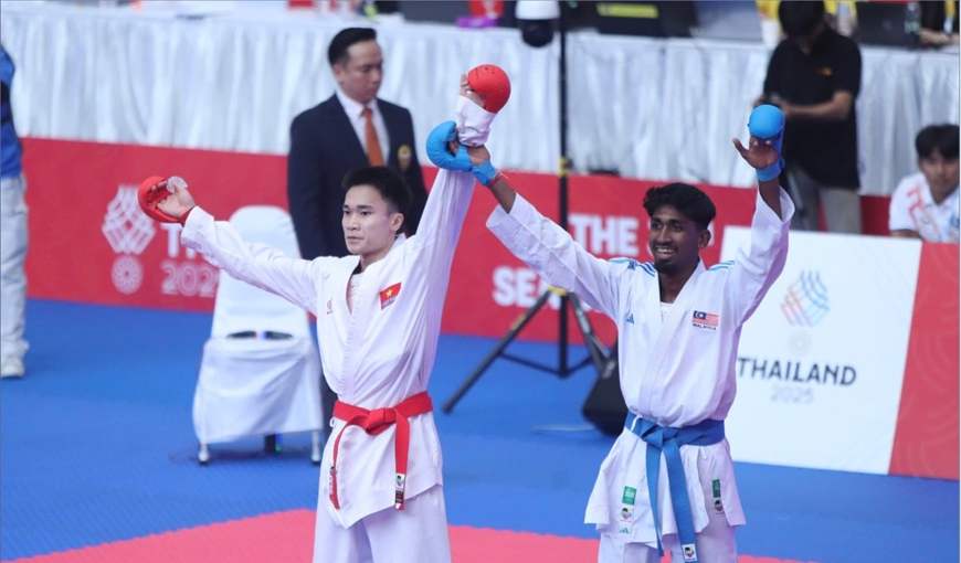 SEA Games 33 đâu chỉ có thắng-thua mà còn có những khoảnh khắc đầy nhân văn. Sau khi giành chiến thắng ở chung kết đối kháng hạng 55kg nam môn karate vào chiều 12-12, võ sĩ Kaliana (Malaysia) cùng giơ tay võ sĩ Việt Nam-Chu Văn Đức (thua trận) trong khoảnh khắc vinh danh nhà vô địch.