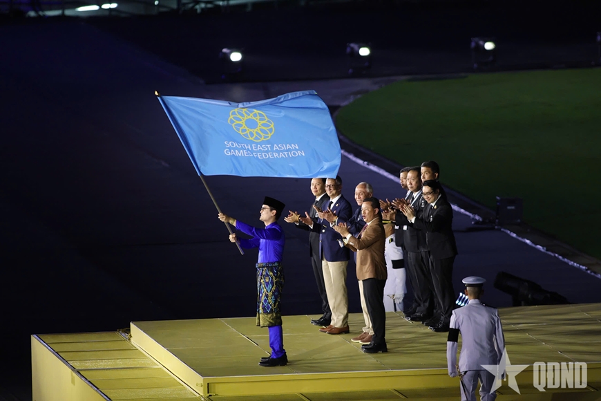 | Đại diện Malaysia nhận cờ đăng cai SEA Games 34. Ảnh: VIỆT AN |