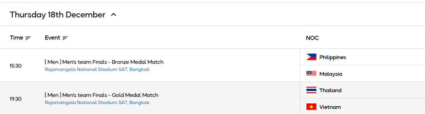 Theo lịch thi đấu, trận chung kết giữa U22 Việt Nam và U22 Thái Lan diễn ra lúc 19 giờ 30 phút ngày 18-12. Trước đó, trận tranh huy chương đồng giữa U22 Philippines và U22 Malaysia diễn ra lúc 15 giờ 30 phút cùng ngày.