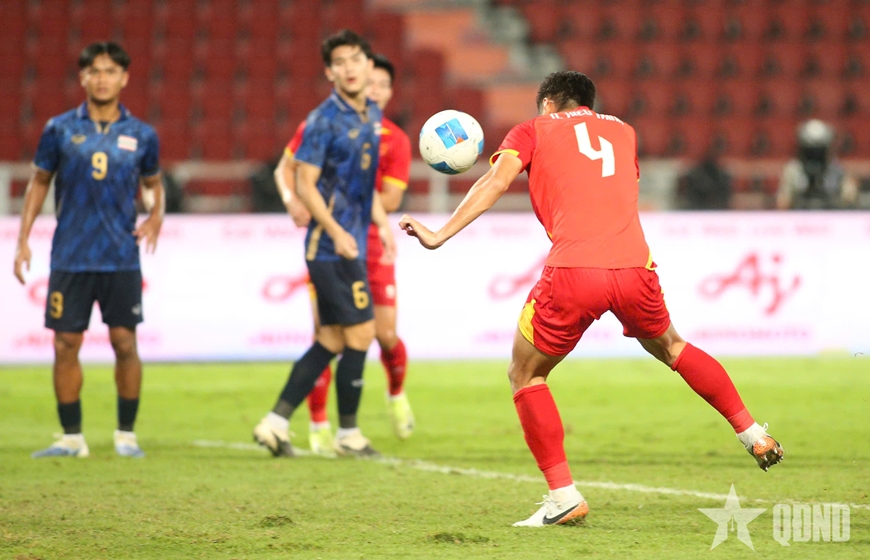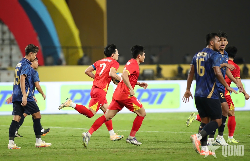 Phút 97, U22 Việt Nam có tình huống phối hợp rất hay. Thủ môn Thái Lan chỉ đẩy được cú sút đầu tiên trước khi Thanh Nhàn băng vào sút bồi nâng tỷ số lên 3-2.