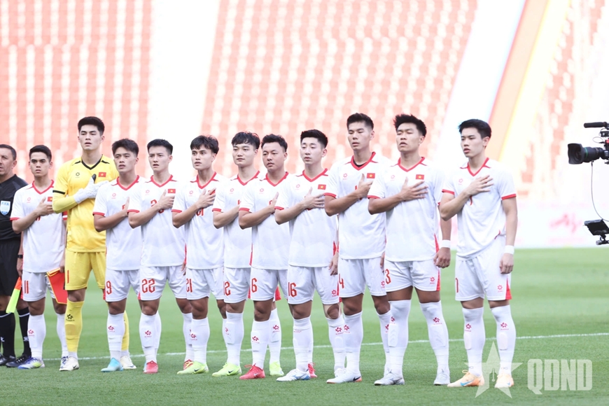 | Các cầu thủ U22 Việt Nam thực hiện nghi thức chào cờ trước trận gặp U22 Lào. Ảnh: VIỆT AN |