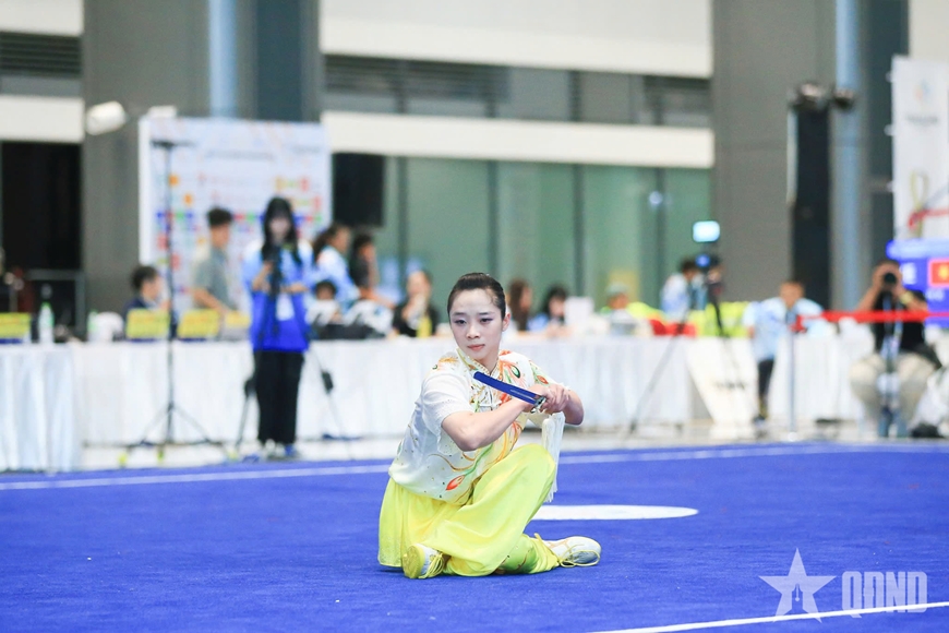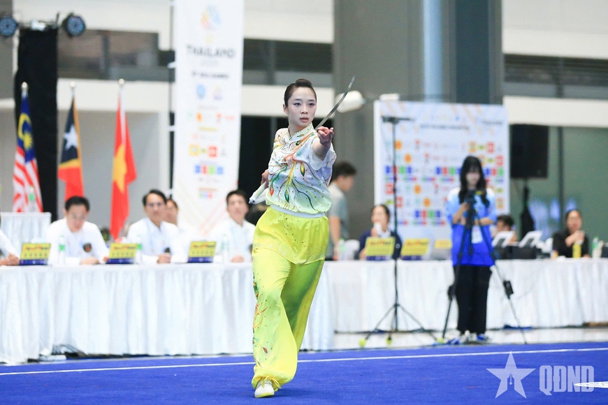 Trong ngày thi đấu thứ hai của nội dung toàn năng wushu SEA Games 33, Dương Thúy Vi xếp thứ ba ở nội dung kiếm thuật, với số điểm 9,670.