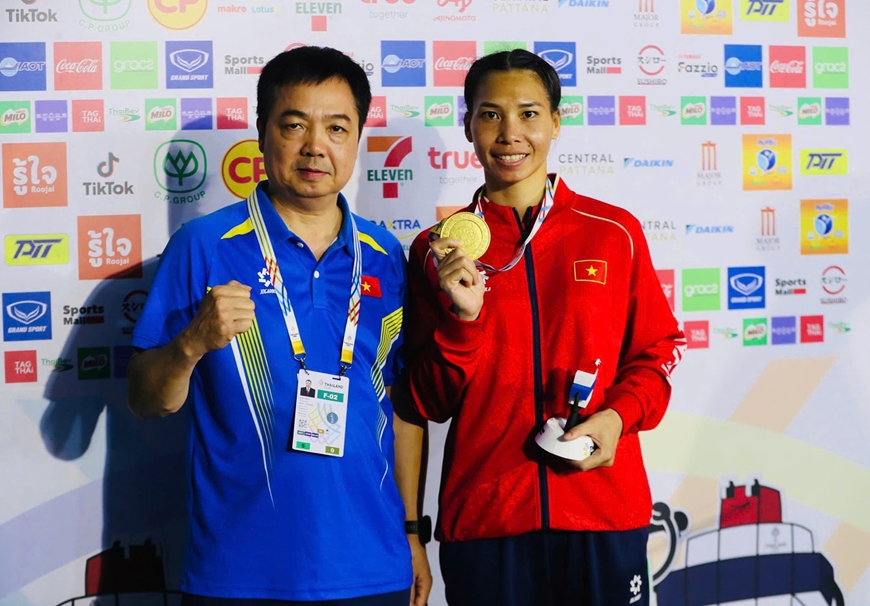 | Nhà vô địch SEA Games 33 môn boxing hạng 60kg nữ Hà Thị Linh (bên phải) và huấn luyện viên trưởng Nguyễn Như Cường. Ảnh: BÙI LƯỢNG |