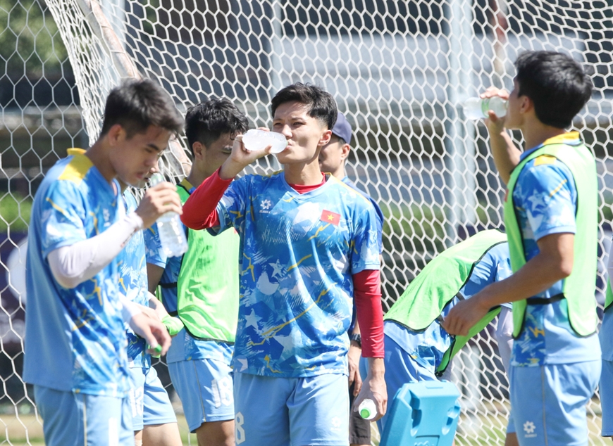 | Các cầu thủ U22 Việt Nam liên tục phải uống nước bởi nắng gắt. Ảnh: VFF |