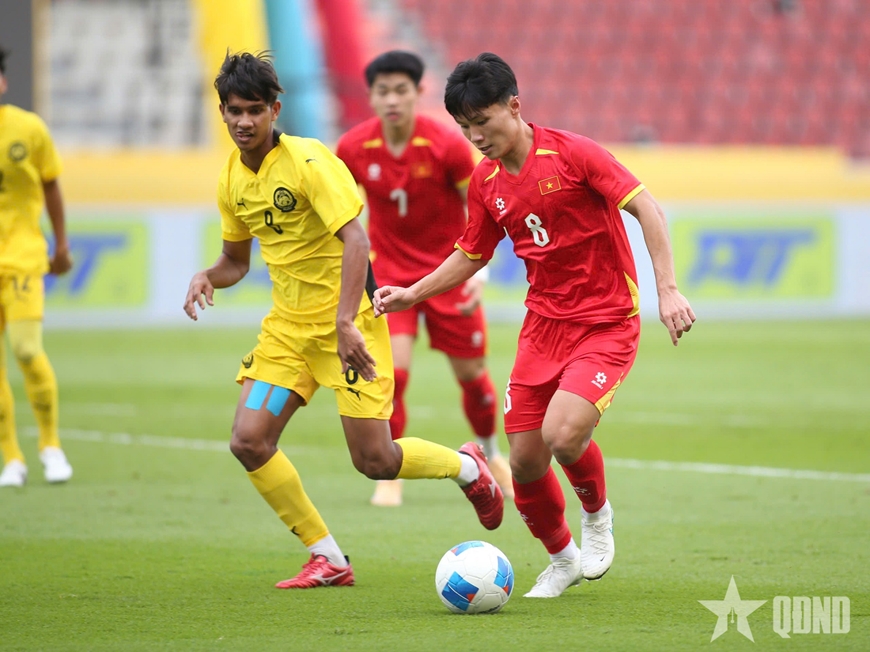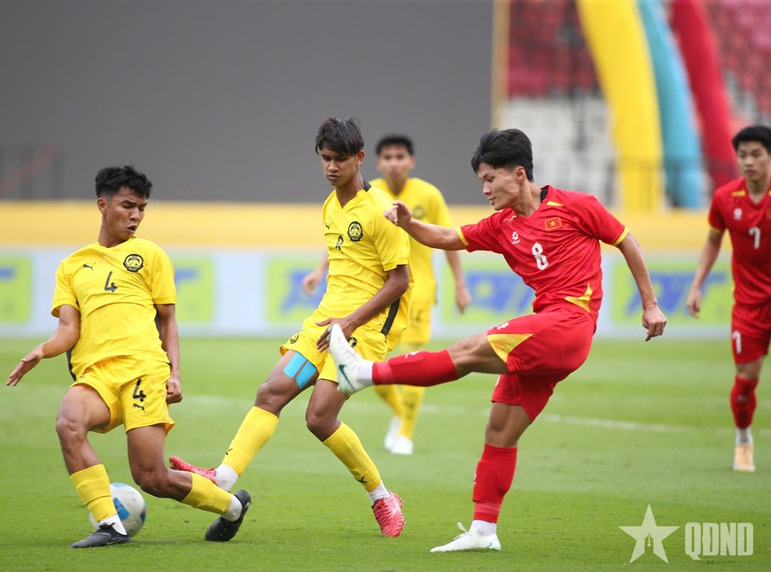 | U22 Việt Nam tạo sức ép mạnh mẽ bên phần sân U22 Malaysia. Ảnh: VIỆT AN |