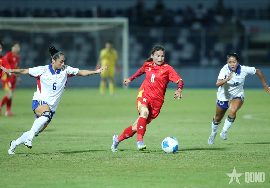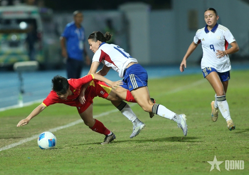 Thể lực giảm sút khiến tuyển nữ Việt Nam gặp bất lợi, trong khi tuyển nữ Philippines khỏe hơn, không giấu ý đồ "đè bẹp" đối thủ. Dù vậy, hai bên chủ yếu đá giằng co ở giữa sân, không dâng quá cao đội hình, nhằm tránh để thua, hơn là quyết tâm có bàn thắng.